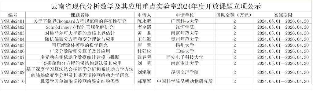 云南省现代分析数学及其应用重点实验室2024年度开放课题已经评审完成,根据专家评审结果,确定对以下10项课题立项资助,现予以公示,公示期为2024年4月26日-5月2日,如有异议,请于2024年5月2日前联系实验室秘书处。单位反映情况需加盖公章,个人反映情况需签署真实姓名并留下联系电话、地址和邮政编码。