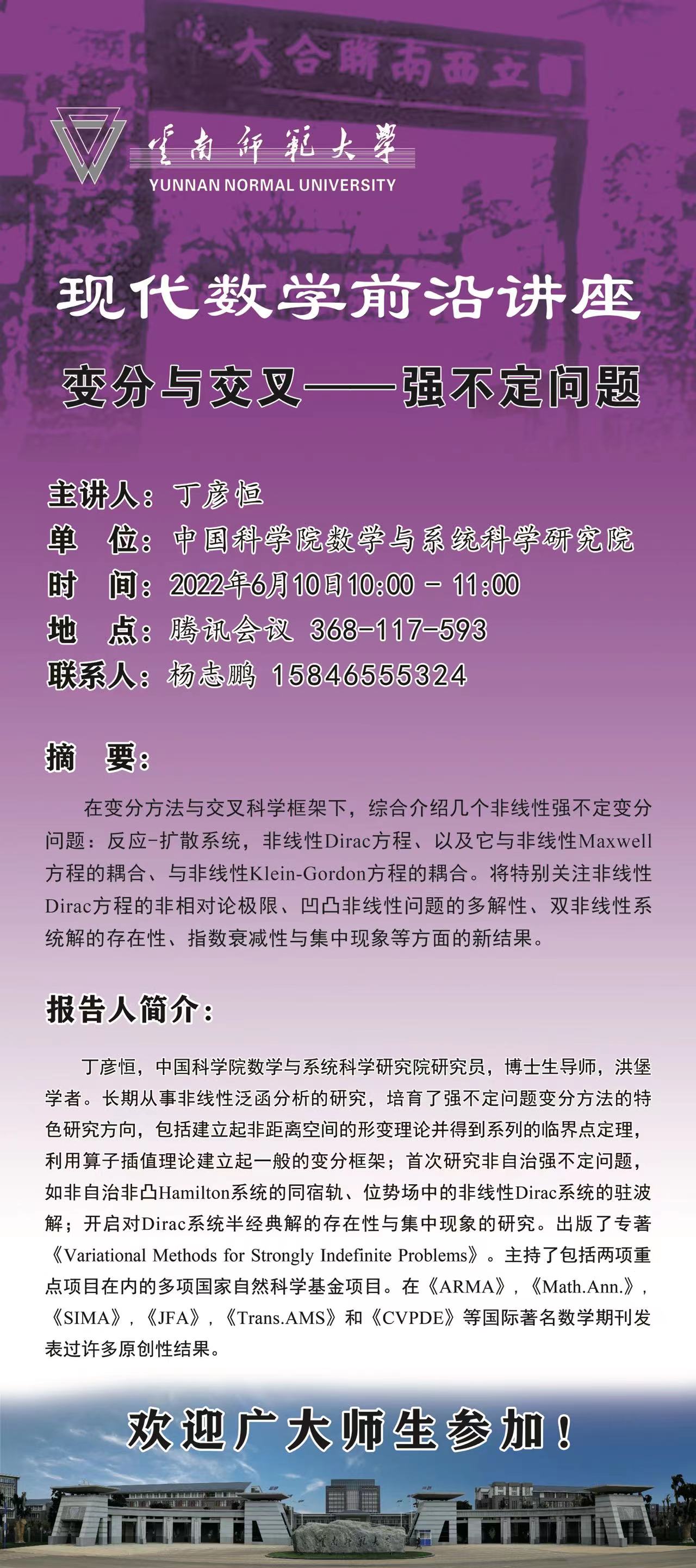 上一条:现代数学前沿讲座 柳彦军 博士 Compactness of exponential nonlinear problems and related applications