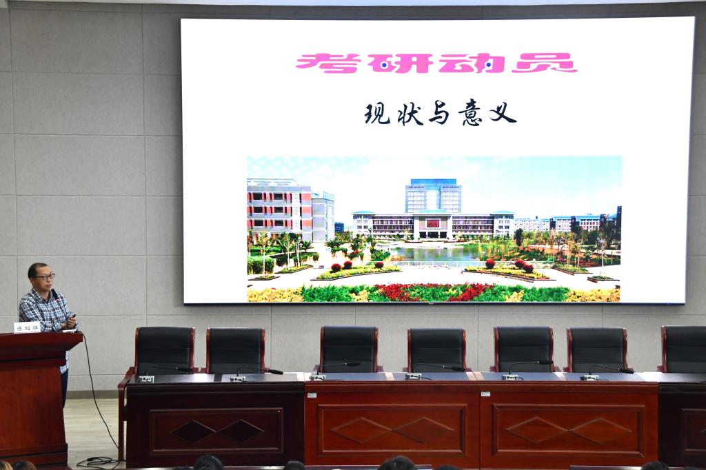 首先,陈绍雄作题为“研路漫漫,求索不止”动员讲话,他强调了考研的重要性,鼓励同学们树立高的学术目标,勇敢追求自己的学术理想。考研是进一步提升自我,增强竞争力的重要途径,也是对学术研究的深入探索。他希望同学们能够积极备考,不怕困难,不畏挑战,勇往直前,实现自己的学术梦想。