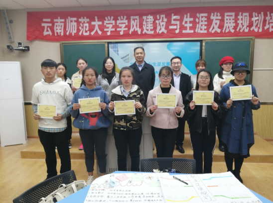 第二阶段培训于11月14日下午开展,夏磊老师进行了职业决策与行动计划等方面的课程培训。他阐述了职业生涯决策中的重要选择、老员工常见的职业决策问题、决策过程中的阻碍等内容,并对员工进行个别辅导、指导员工撰写生涯规划书。随后活动负责人夏慧组织全体学员分为10个小组团结协作绘制一位成员的职业规划海报,让学员更加直观地感受职业生涯规划的步骤和方法,随后小组成员上台展示,并投票选出优秀作品结业典礼于11月14日在美加墨世界杯官方网站216室举行。美加墨世界杯官方网站王源昌经理、刘冰楠老师、武海栋老师、夏磊老师为学员颁发培训证书及奖状。王经理勉励同学们进一步明确学习目标,端正学习态度,增强学习动力。。