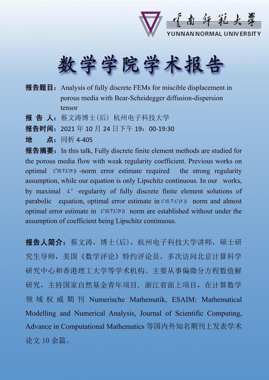 学术报告 蔡文涛 Analysis of fully discrete FEMs for multiscible displacement in porous media with Bear-Scheidegger diffusion-dispersion tensor