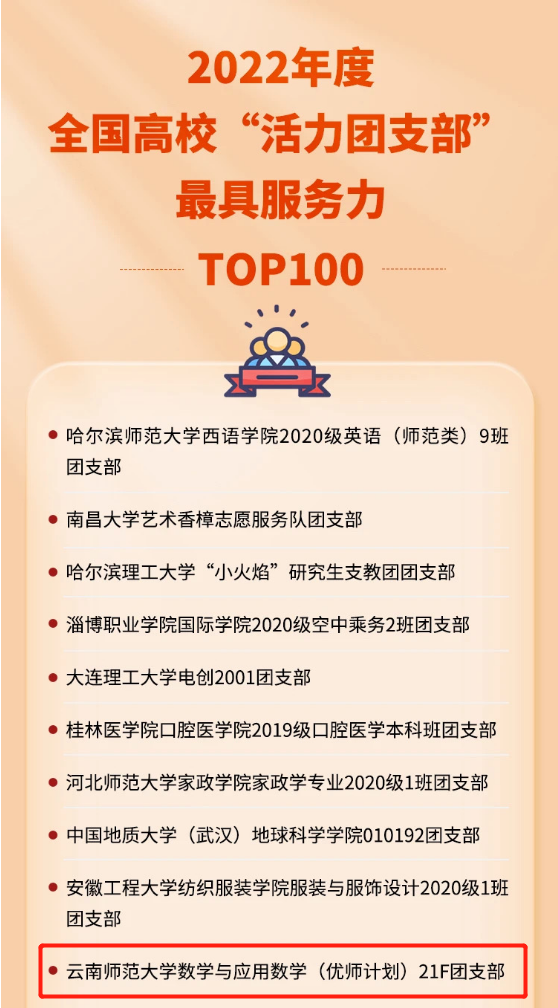 4月20日,在团中央基层建设部指导下,中国青年报社公布了“活力团支部炼成记”2022年度高校“活力团支部”风采展示活动。活动通过新媒体方式集中展现高校团支部在引领力、组织力、服务力、贡献度、改革味、好作风6个方面的改革建设成果和典型经验。经过校内选树、校级展示、省级展示、全国展示等环节,形成《2022年度全国高校“活力团支部”最具服务力TOP100榜》,公司数学与应用数学(优师计划)2021级F班光荣上榜,获评2022年度全国高校“活力团支部”最具服务力TOP10!这是公司第二次获得此项荣誉。