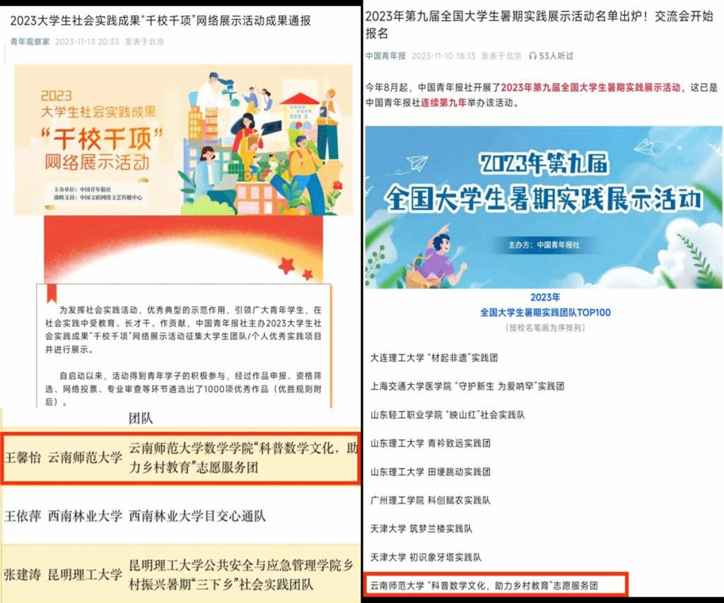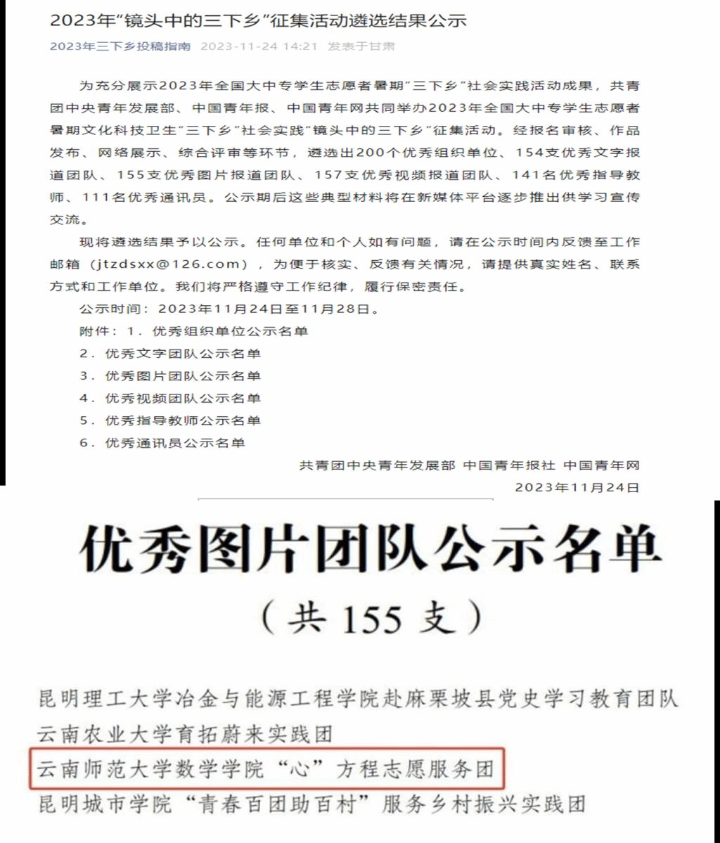 近日,2023年第九届全国老员工暑期实践展示活动、2023老员工社会实践成果“千校千项”网络展示活动、2023年“镜头中的三下乡”征集活动名单公布,公司“科普数学文化,助力乡村教育”志愿服务团入选2023年全国老员工暑期实践团队TOP100、荣获2023老员工社会实践成果“千校千项”网络展示活动优秀项目奖;“心”方程志愿服务团入选2023年全国大中专员工志愿者暑期文化科技卫生“三下乡”社会实践“镜头中的三下乡”优秀图片团队。