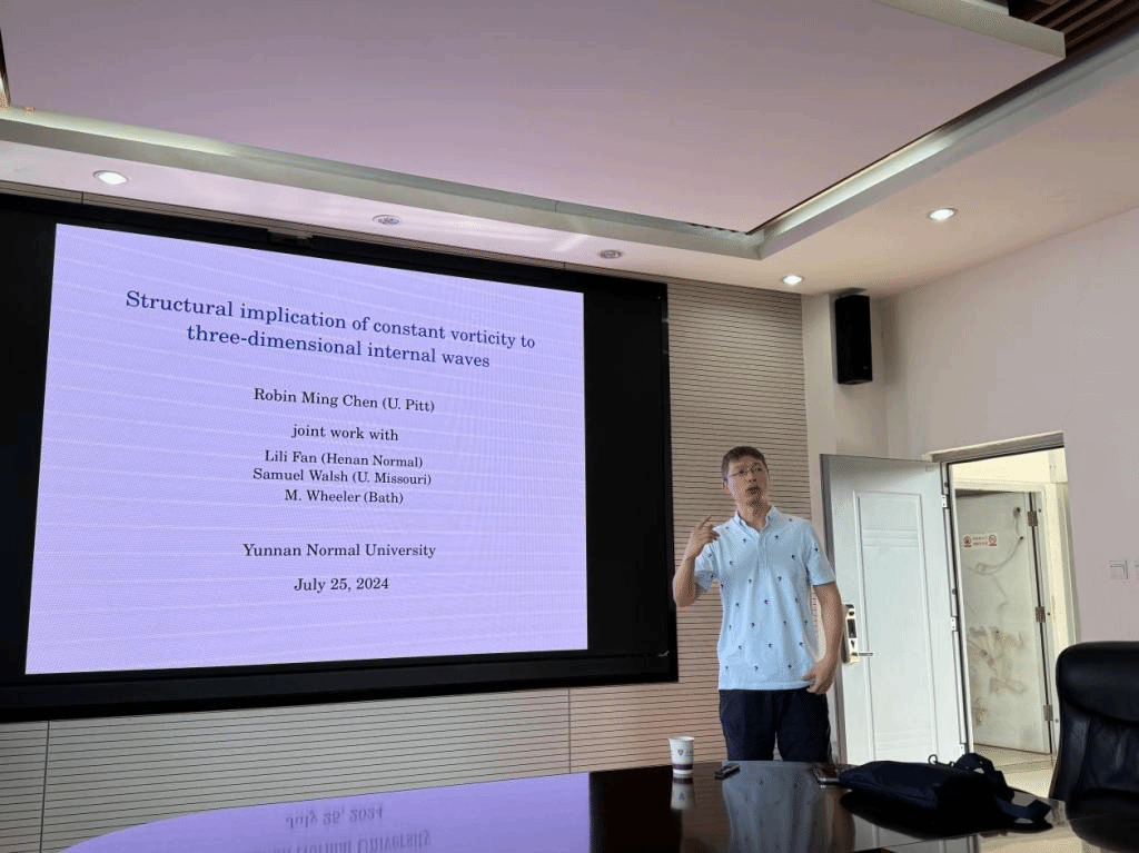 7月25日,由美加墨世界杯官方网站举办的“现代数学前沿讲座”第91讲在武之楼322会议室举行,美国匹兹堡大学陈明副教授作了题为《Structural implication of constant vorticity to three-dimensional internal waves》的学术报告。报告由美加墨世界杯官方网站经理刘祥清教授主持,学院30余名师生参加。