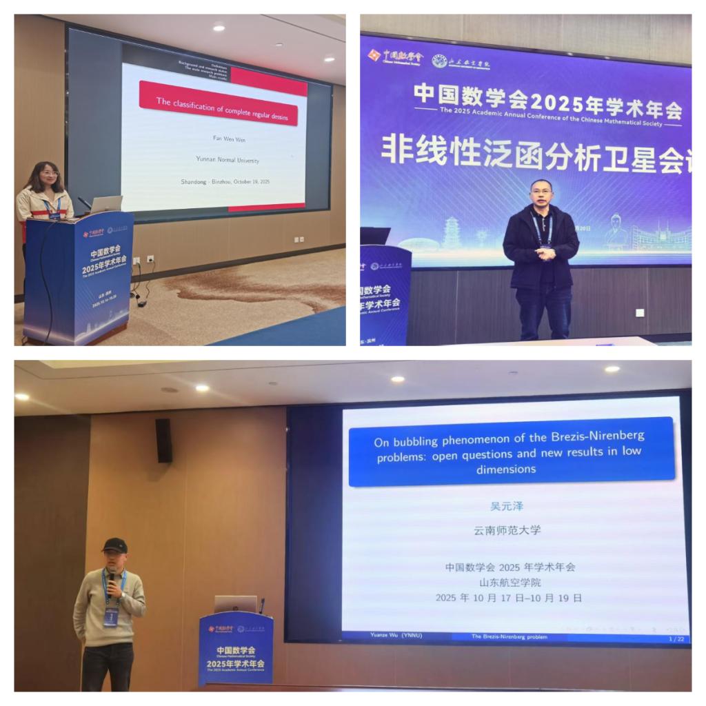 吴元泽教授、梅丽杰教授、范文文教授应邀在偏微分方程、计算数学、代数与数论等方向分别作题为 “On bubbling phenomenon of the Brezis-Nirenberg pro- blems:open questions and new results in low dimensions ”、“Structure- preserving operator-splitting explicit methods for the generalized Klein-Gordon-Schrödinger equations”、“The classification of complete regular dessins” 的分组报告,详细介绍了各自的最新研究成果。赵富坤教授受邀参加并主持了非线性泛函分析卫星会议。