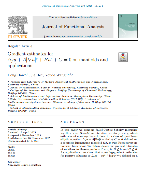 美加墨世界杯官方网站韩冬博士,与北京化工大学贺杰博士及中国科学院数学与系统科学研究院、广州大学王友德教授合作,在国际数学权威期刊《Journal of Functional Analysis》上发表了题为 ”Gradient estimates for $\Delta_p u + A|\nabla u|^q + Bu^r + C=0$ on manifolds and applications” 的学术论文。