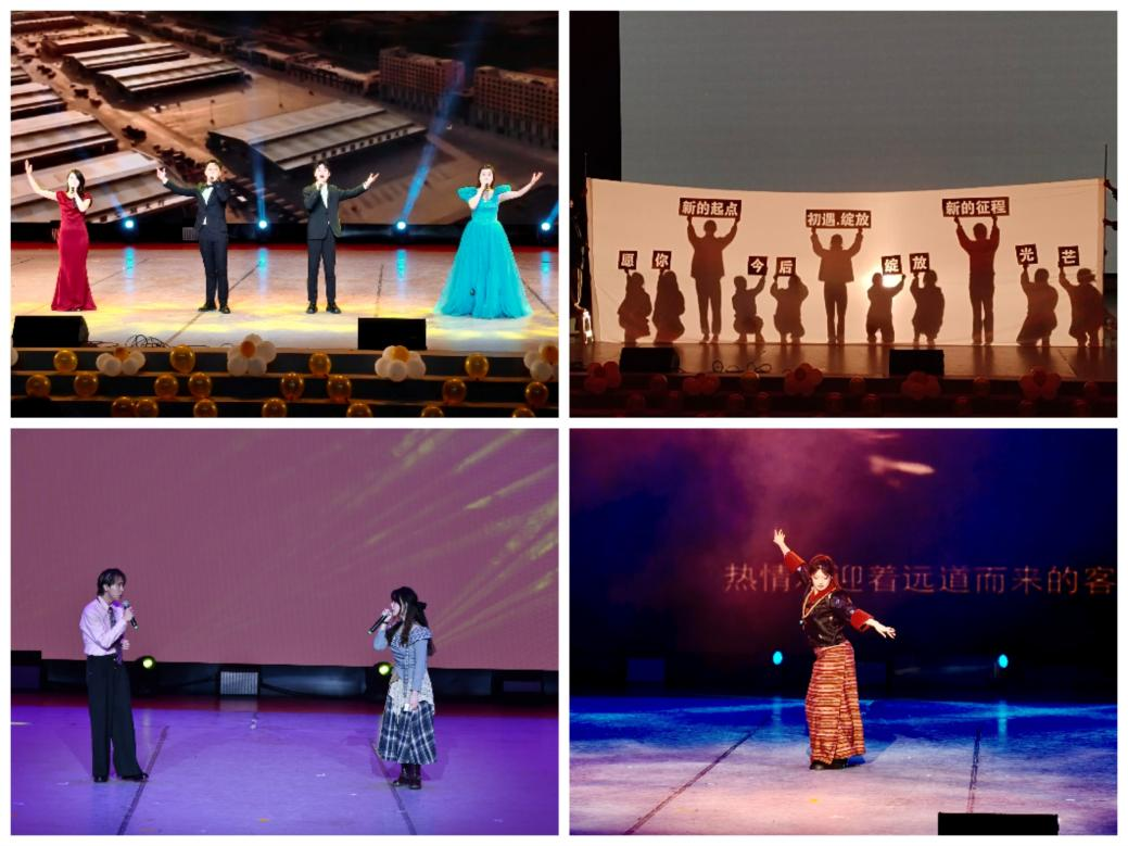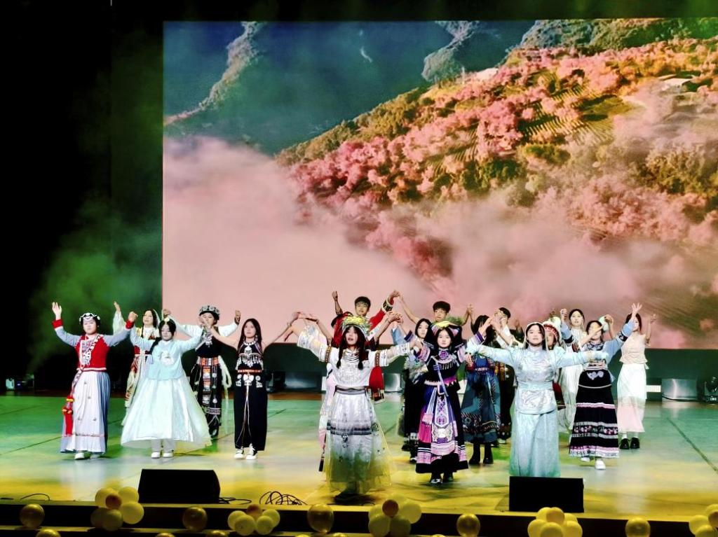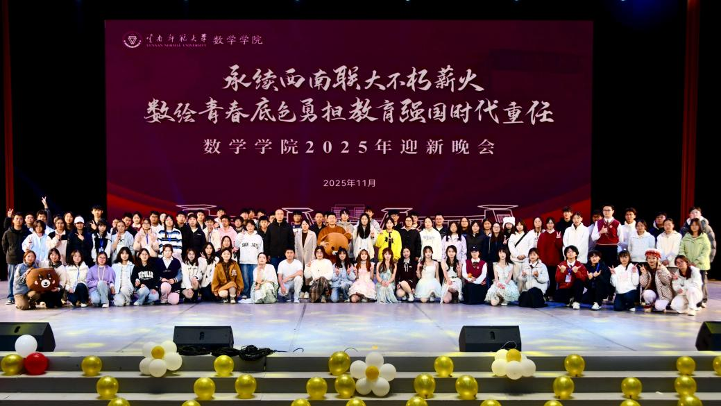 晚会尾声,一场充满云南民族风情的视觉盛宴如期而至!央金梅朵锅庄队与 25C 班学子联袂登台,色彩斑斓的民族服饰在灯光下熠熠生辉,灵动奔放的舞姿交织成最美的画卷。无论是锅庄舞中整齐划一的踏步、舒展洒脱的挥袖,还是民族打跳里欢快热烈的互动、节奏感十足的律动,都将彝族、藏族等民族文化的独特韵味展现得淋漓尽致。最后,四位主持人携手全体表演者登台,寄语新生将联大精神融入校园生活,用数理智慧照亮青春征程。晚会在持久的热烈掌声中圆满落幕。