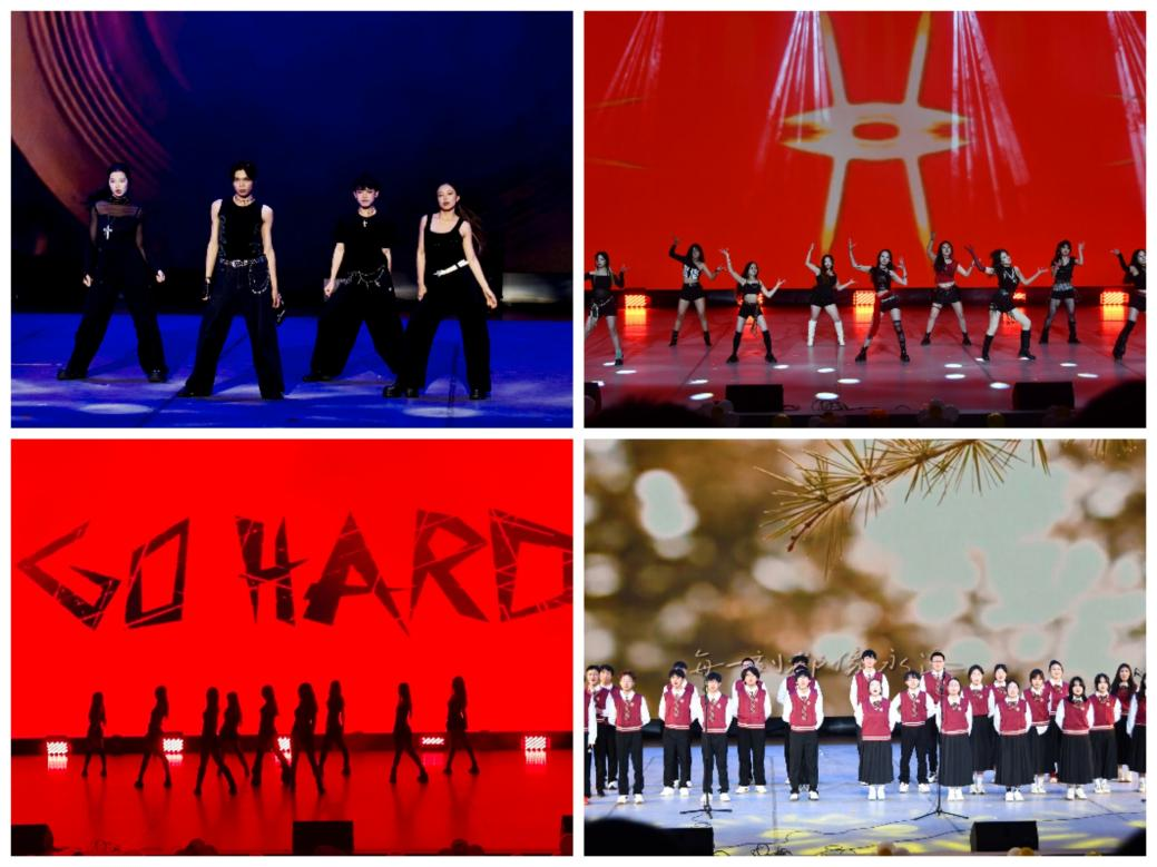 后续登场节目同样精彩纷呈:24D班查嘉琪演唱的《Young and Beautiful》温柔治愈;唯街舞社《Whiplash》活力四射;25G、24G、24A班的歌曲串烧深情激昂;院合唱团《我们的明天》寄托美好憧憬;院舞蹈队《Go Hard》展现专业水准;25B班班主任杨兰老师的惊喜献舞,瞬间让全场掌声雷动;艺术学院同学带来的红色四重唱更是点燃了全场同学的爱国热情,让整场晚会的专业质感与情感感染力再上一个台阶。