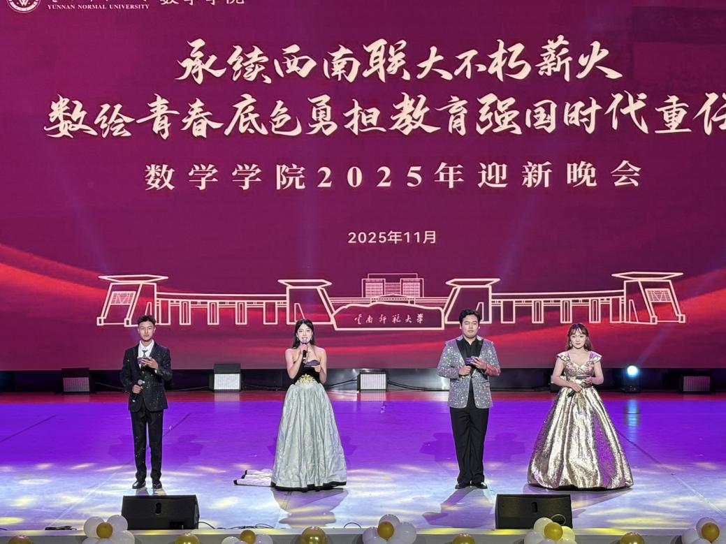 动感十足的鼓点划破夜空,劲歌热舞交织成燃动的视听盛宴——开场舞演员们以矫健的身姿、饱满的热情点燃全场,掌声与欢呼声此起彼伏。紧随其后,四位主持人身着正装惊艳亮相,他们抑扬顿挫的语调饱含深情,字字句句既有对烽火岁月里西南联大的深情回望:那束穿越硝烟的数理之光,照亮了先辈们“刚毅坚卓”的治学之路,铸就了“为国读书”的精神风骨;更凝聚着当代数学学子的赤子情怀——他们循着先辈足迹,赓续严谨治学的初心,怀揣对数学领域的无限热忱,誓要以智慧为刃、以坚守为基,扛起科技报国的时代重任,在新时代的征程上书写属于数学人的豪情与担当。在全场师生的热切期盼中,这场融汇历史厚度与青春活力的晚会,正式拉开了帷幕。