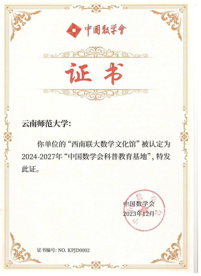 公司西南联大数学文化馆相继获批成为5个国家和省级教学科研平台:云南省科学技术厅“云南省科普教育基地”、中国科学技术协会“全国科普教育基地”、教育部首批“大思政实践教学基地”(教育部和科技部联合设立为科学精神实践教学基地)、云南省科普教育基地联合会副理事长单位、中国数学会“科普教育基地”。(西南联大数学文化馆供稿)